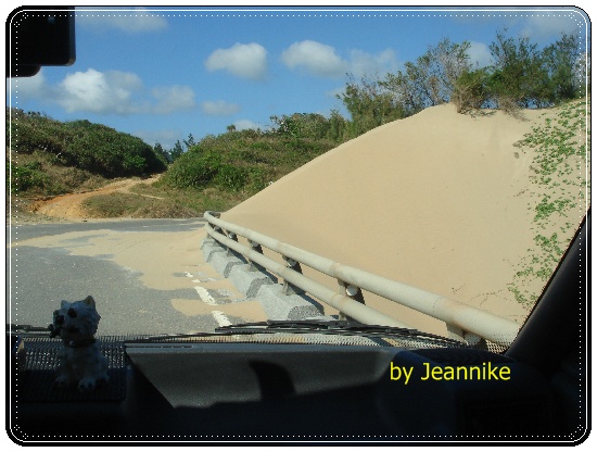 在車上觀察一下風吹砂,據司機告知,白皙乾淨的沙子一直吹到大馬路上,沙子聚