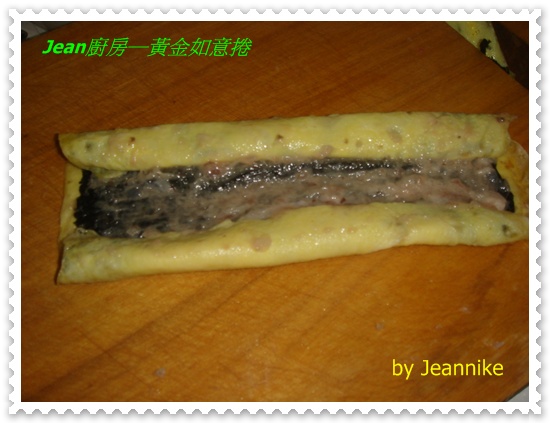 4、半張蛋皮攤開,將1/4份蝦絨抹平,上舖紫菜,在抹上1/4份蝦絨,由兩端捲