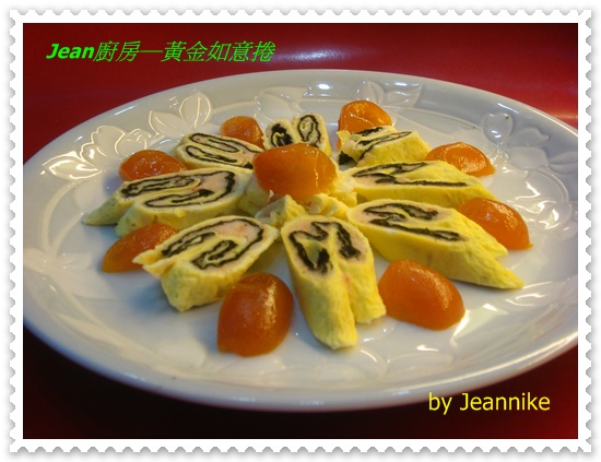 2、擺盤完成後,黃金如意捲搭配金棗,非常對味,口感很棒,也可以淋上勾薄芡的