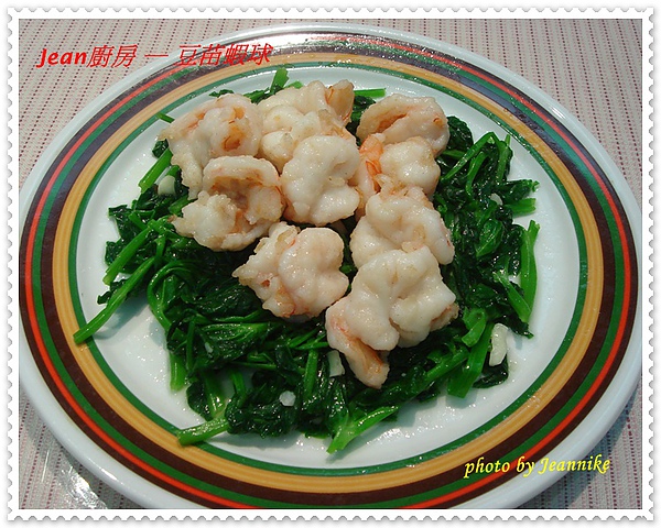 材料:蝦8-10隻、豆苗半斤、蒜頭5粒、薑片3片、蔥白3小段