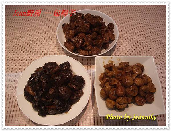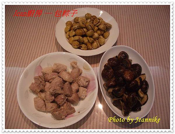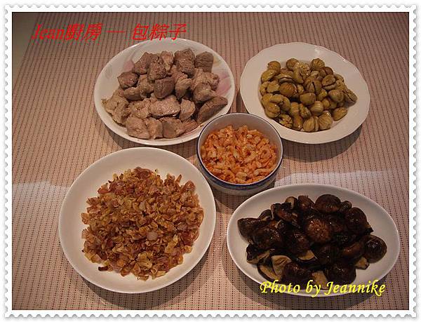 材料:糯米3斤 梅花肉2斤 乾栗子半斤(約50粒) 大蝦米4兩 紅蔥頭(適量)