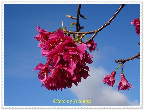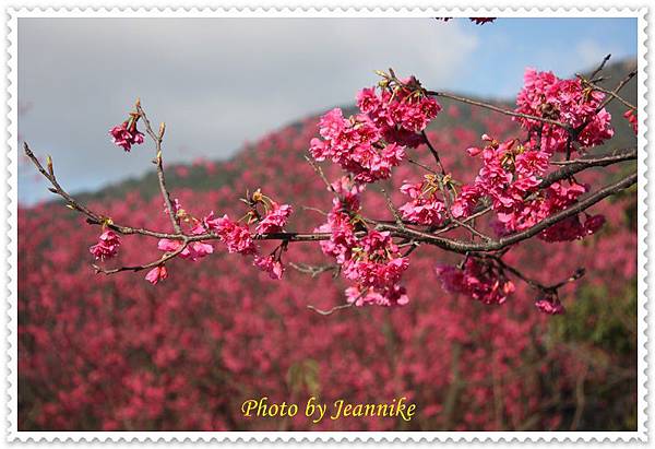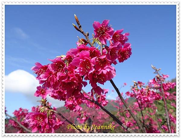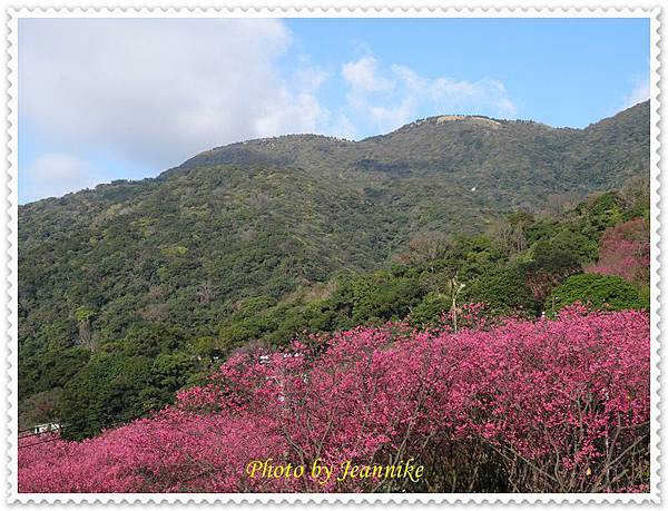 櫻花,和遠方青翠的山巒及藍天白雲相呼應,形成一幅美麗的圖畫。